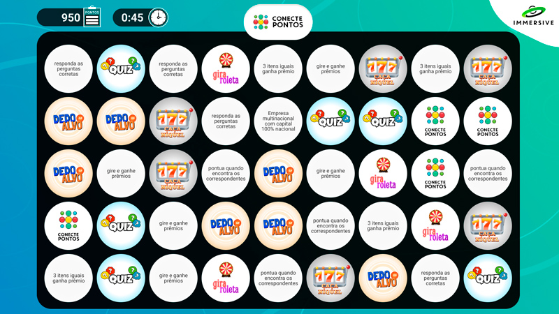 Uma das mecânicas mais viciantes e conhecidas entre o público. O objetivo do Conecte Pontos é ligar o máximo de itens iguais para conquistar pontos. Esses itens podem ser embalagens, marcas, palavras, produtos, ou qualquer imagem que deseja divulgar.